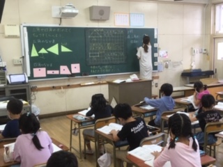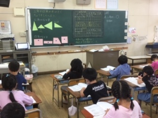 ・2年生が算数で三角や四角の形の特徴を調べる学習をしました。辺や頂点の数を調べました。