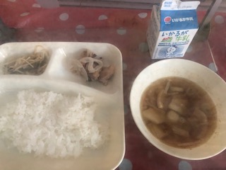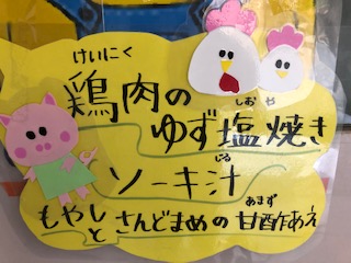 鶏肉のゆず塩焼き、ソーキ汁、もやしとさんどまめの甘酢あえ、ごはん、牛乳