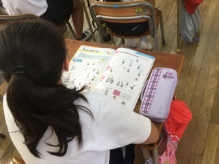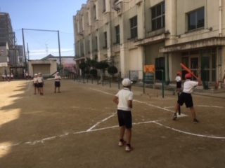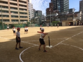 ・3年生が体育で『ティーボール』をしました。初めての学習なので、まず教室で副読本を使って、ティーボールのやり方やルールの説明をしました。その後、運動場で実際にやってみました。止まっているボールを打つので、みんな楽しくゲームができました。