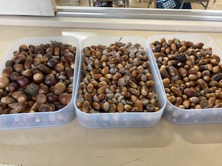 ・1年生が全校たてわり遠足で鶴見緑地公園に行きました。そこで拾い集めたどんぐりがたくさん置いてあります。秋を感じます。たくさんのどんぐりをどのように使うのか楽しみです。