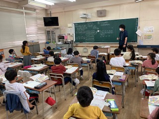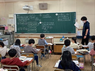 ・2年生が算数『かけ算』の単元です、かけ算の場面を式です表す活動を通して、かけ算の意味を学びました。一つ分のまとまりを同じにして、いくつ分あるかを考えると、かけ算の式にできることを学びました。