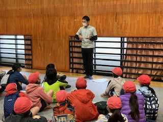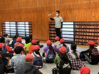 小雨の中、魚つかみに行きます。体育館で説明を受けました。つかみ方や串のさし方などを教えてもらいました。