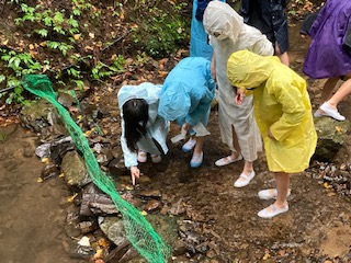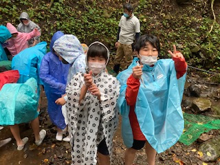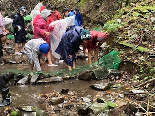 小雨の中、魚つかみをしました。魚を初めてつかんだ児童は歓声をあげていました。みんな夢中で魚をつかまえていました。