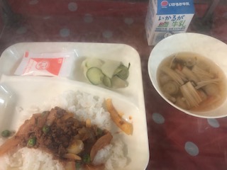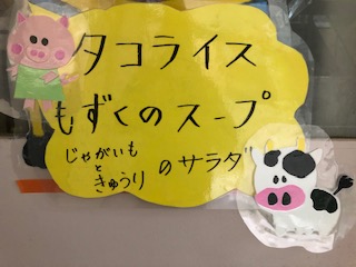 タコライス、もずくのスープ、じゃがいもときゅうりのサラダ、牛乳