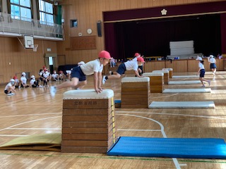・5年生は体育の学習で跳び箱をしています。今日は開脚跳びを練習しました。自分に合う高さの跳び箱で、安全に着地できるように練習しました。