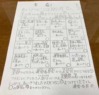 今日から児童会運営委員会が考えた『あいさつビンゴ』が始まりました。16個のお題のクリアをめざして取り組みます。朝からいつもと違って、元気な声で笑顔であいさつする児童が増えています。