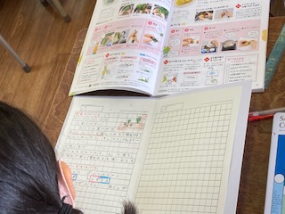 ・5年生が家庭科で『クッキングはじめの一歩』で、ゆでて食べる調理をします。青菜やじゃがいものゆで方などを学習しました。