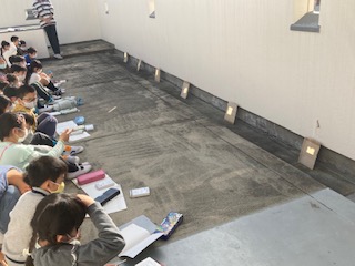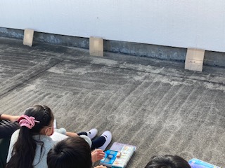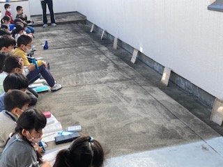 ・3年生が理科で『跳ね返した日光を重ねると、どうなるだろうか』という課題で実験をしました。屋上のプールサイドで鏡0枚、1枚、3枚の時の明るさと温度を調べました。