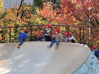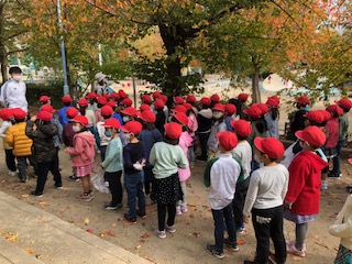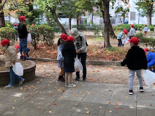 ・1年生が公園たんけんに行きました。公園内の秋を探し、形や色の変わった落ち葉を集めてきました。集めた後は、公園で楽しく遊びました。