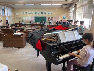 ・5年ろ組が音楽ミニ演奏会を行いました。歌、ボディパーカッション、リコーダー、オルガン演奏、合奏をしました。最後の合奏『キリマンジェロ』は迫力がありよかったです。みんなの心が一つになり演奏できました。担任から1学期より上達しているとほめてもらいました。