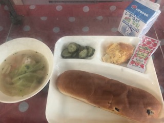 ツナポテトオムレツ、スープ、きゅうりのバジル風サラダ、ケチャップ、パン、牛乳