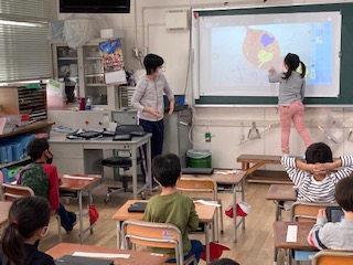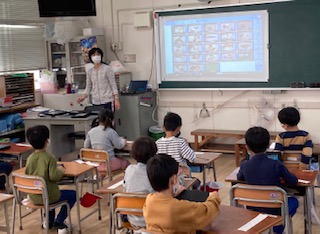 1年生が公園で見つけた葉っぱや実を使って、さかなやうさぎなどを作りました。それをタブレット端末に取り入れて、説明の文字を書き込みました。クラスのみんなにお話をしました。