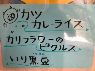 カツカレーライス、カリフラワーのピクルス、いり黒豆、牛乳