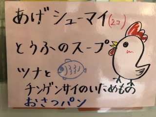 あげシューマイ、とうふのスープ、ツナとチンゲンサイのいためもの、おさつパン、牛乳