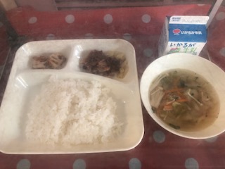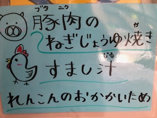 豚肉のねぎじょうゆ焼き、すまし汁、れんこんのおかかいため、ごはん、牛乳