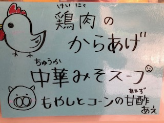 鶏肉のからあげ、中華みそスープ、もやしとコーンの甘酢あえ、ごはん、牛乳
