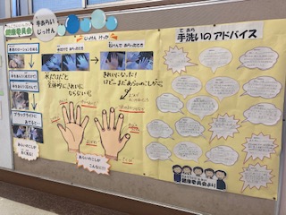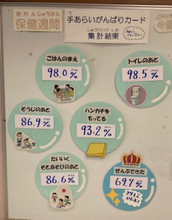 保健室の掲示板には、健康委員会の手洗い実験の結果とアドバイス、手洗いがんばりカード集計結果が掲示してあります。手洗いは概ねできていますが、掃除の後と体育や外遊びの後の手洗いをこれからがんばってほしいです。