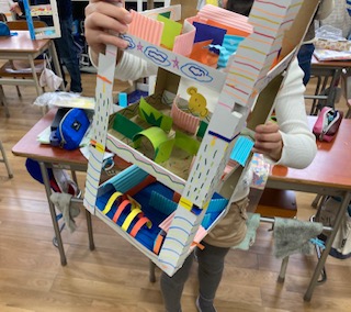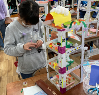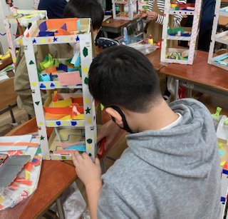 4年生が図画工作『コロコロガーレ』ができあがってきました。一番上からビー玉を転がし、一番下まで転がす手作りゲームです。