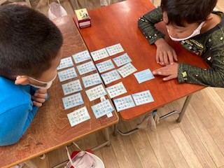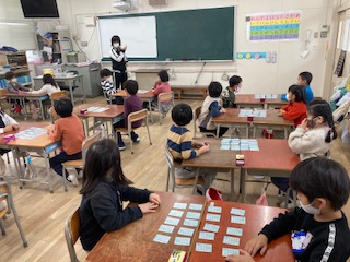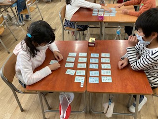 1年生が5色百人一首をしました。20枚の札を2人で取りあいました。先生が読む下の句を聞いて札を探しました。楽しくできました。
