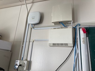 本日、各教室に無線アクセスポイントが設置されました。今回設置した無線アクセスポイントは、いま学校にあるタブレット端末や授業用パソコン、今後整備される一人一台学習者用端末に接続が可能です。