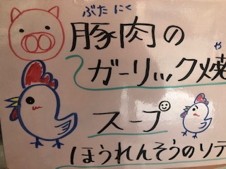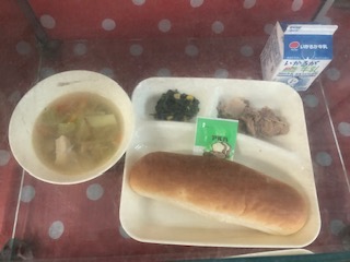 豚肉のガーリック焼き、スープ、ほうれんそうのソテー、マーガリン、パン、牛乳