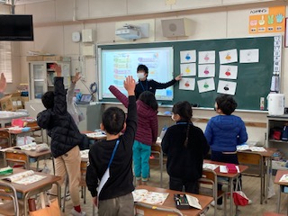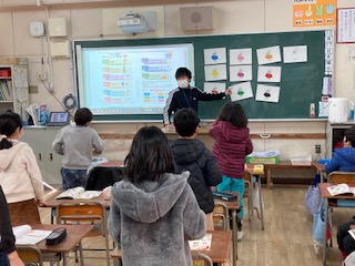 3年生が外国語活動を行いました。先生が、yellow fruitと質問して子どもたちが、Lemonと答えるような、色を使った質問をして楽しく英語に触れることができました。