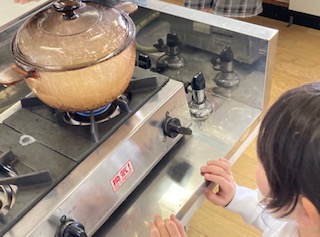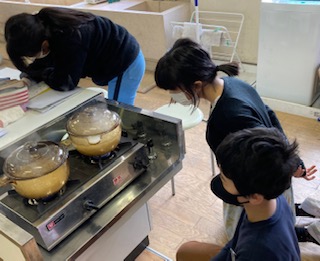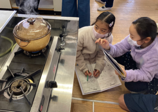 5年生が家庭科で米からご飯への変化の仕方を調べました。本来なら味噌汁も作って調理実習をするのですが、新型コロナウイルス感染の拡大のため、調理実習ができなくなりました。そこで、担任がお米を洗い、子どもたちはお米の炊き上がりを観察しました。