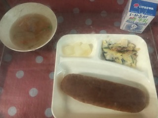 ほたて貝のグラタン、スープ、和なし、パン、牛乳