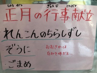 れんこんのちらしずし、ぞうに、ごまめ、のり、牛乳