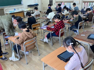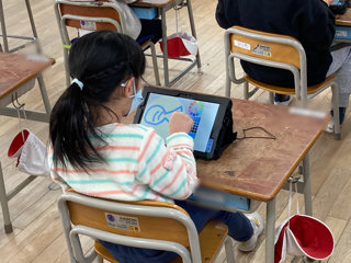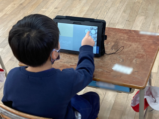 1年生がICT支援員と一緒にタブレット端末を使って、ビスケットをしました。魚が口をパクパクさせて、泳ぐようにプログラミングをしました。とても楽しく学習ができました。子どもは覚えるのが早いです。