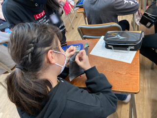 ・6年生が家庭科でポケットティッシュケースを作りました。丁寧に手縫いで作っています。(上の写真)
