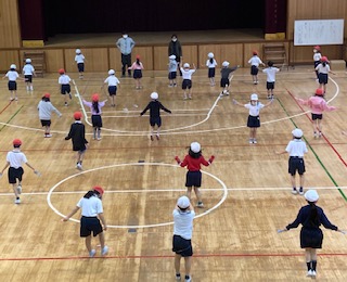 ・1年生が体育館でなわとびをしました。前まわしとびで、長くとべるように練習しました。(下の写真)