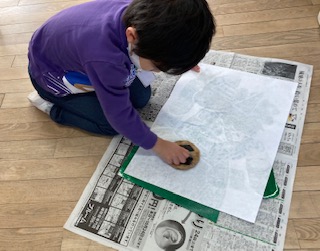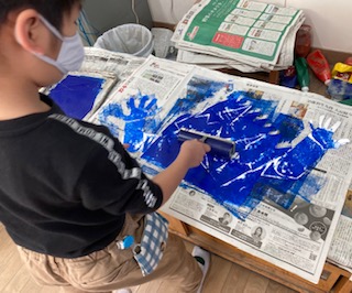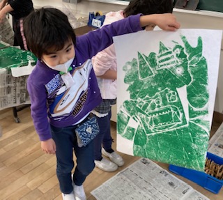 1年生が「かみはんが」をしました。画用紙を切って鬼を作り、ローラーで色をつけ、和紙を乗せバレンで丁寧にこすりました。すると、見事に鬼ができあがりました。のびのびとした作品ができました。