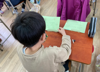 2年生が生活科で「大きくなった自分のことをまとめよう」の学習で、成長の記録を作っています。「ありがとう」と「すごいね」カードを書きました。友だちからの「すごいね」カードをうれしそうに読んでいました。