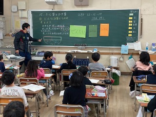 2年生が算数「たし算とひき算」で、文章の場面を図で表し、その図を全体と部分に注目して見て、計算式を考えました。