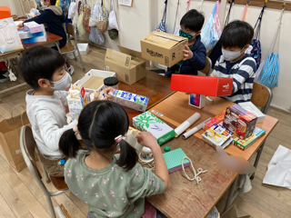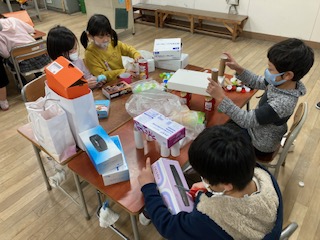 1年生が図画工作で、箱の使い方を工夫して動物を作りました。箱の大きさ、色、形をうまく使って動物を作りました。また、積み方、立たせ方を工夫しました。できあがりが楽しみです。
