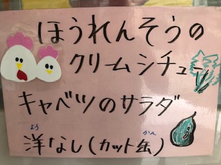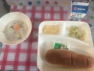 ほうれん草のクリームシチュー、キャベツのサラダ、洋なし、パン、牛乳