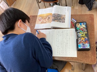 3年生が国語の説明文「人をつつむ形-世界の家めぐり」を学習しています。書かれている内容を表に整理して読み取りました。最後は、自分で本時のまとめを書きました。