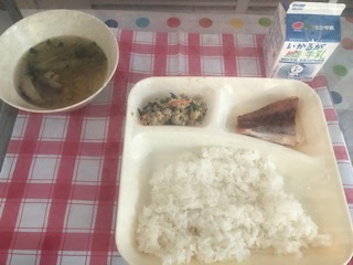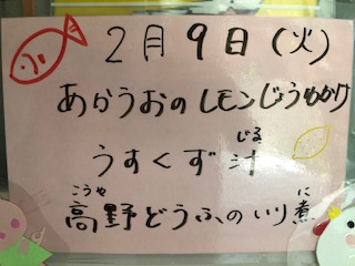 あかうおのレモンじょうゆかけ、うすくず汁、高野どうふのいり煮、ごはん、牛乳