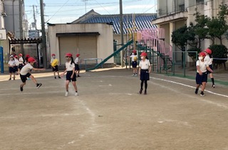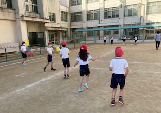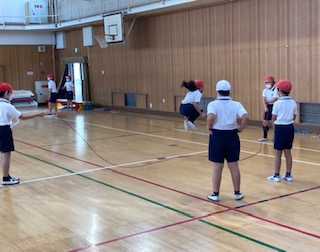 3年生が体育の学習で、運動場ではタグラグビーを、体育館では大縄跳びをしました。
