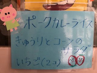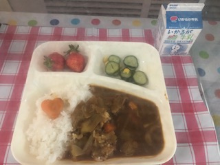 ポークカレーライス、きゅうりとコーンのサラダ、いちご、牛乳