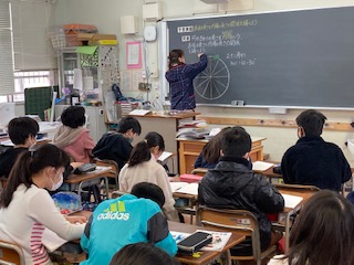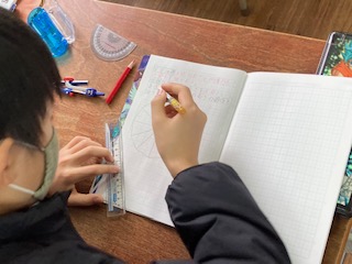 5年生が算数「正多角形と円周の長さ」を学習しています。直径の長さと円周の長さの関係を調べました。正十二角形を作図しました。中心角を考えて正確に書きました。