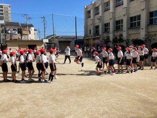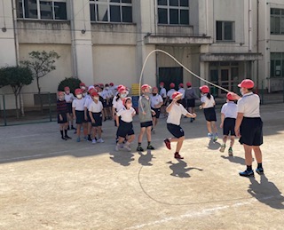 4年生が体育学習で長なわをしています。クラスで連続とびが何回できるか、挑戦しています。