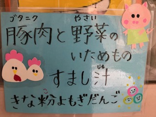 豚肉と野菜のいためもの、すまし汁、きな粉よもぎだんご、ごはん、牛乳