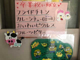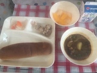 フライドチキン、カレーシチュー、おいわいピクルス、フルーツゼリー