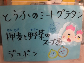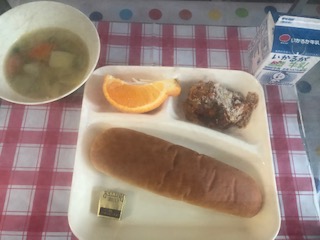 とうふのミートグラタン、押し麦と野菜のスープ煮、デコポン、パン、牛乳