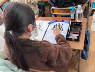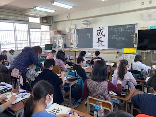 5年生が書写「成長」を書きました。ひじをあげて、一画ずつ筆を整えて書くようにしました。