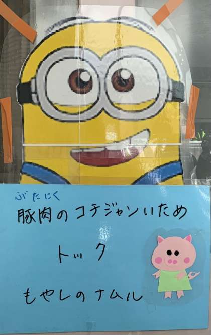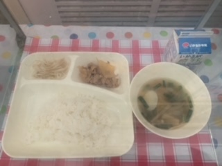 豚肉のコチジャンいため、トック、もやしのナムル、ごはん、牛乳