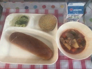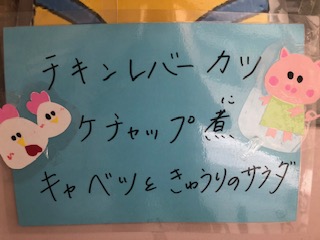 チキンレバーカツ、ケチャップ煮、キャベツときゅうりのサラダ、パン、牛乳