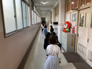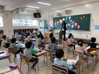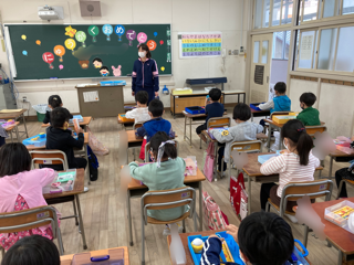 1年生にとって学校生活の1日目です。最初は緊張していましたが、手紙の配り方やトイレの使い方など、学校生活の仕方を学びました。学校探検もして、楽しく過ごすことができました